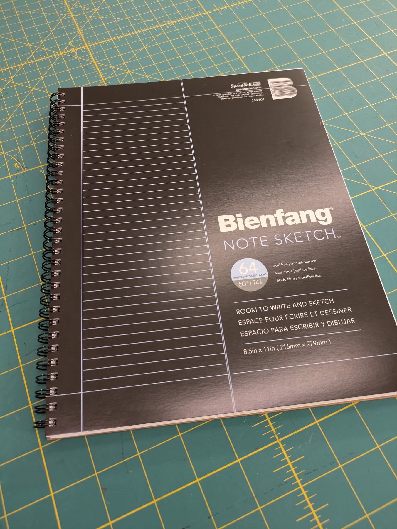 Each page of this sketch book has lines on the left side for writing, and a blank right side for drawing sketches, pasting in swatches, or making more freeform notes. It has a spiral binding so your pages lay flat while you work.