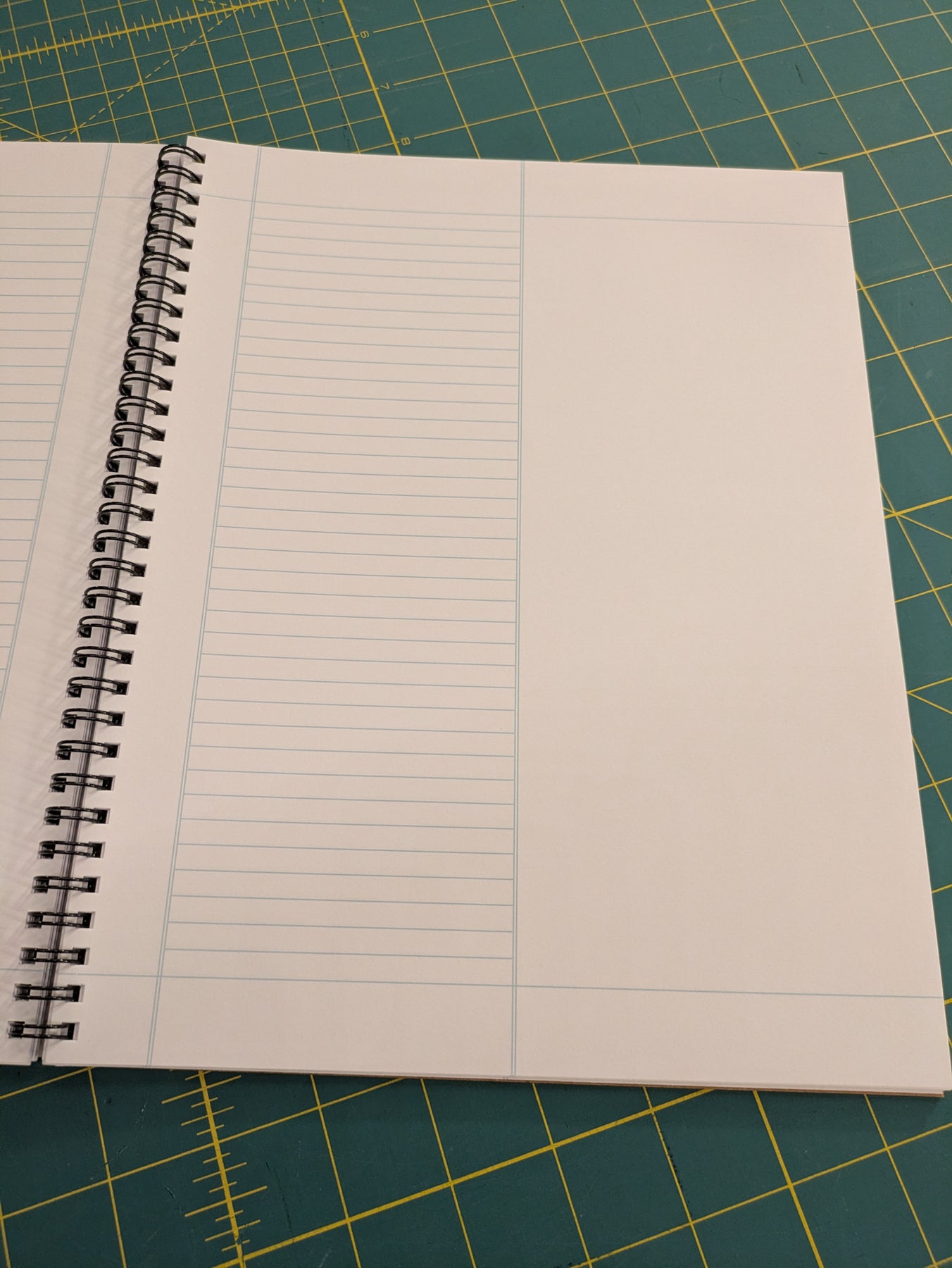 The pages are lightweight white paper, 64 pages 8.5" by 11" (21.6 cm by 28 cm) with lines on both sides.
