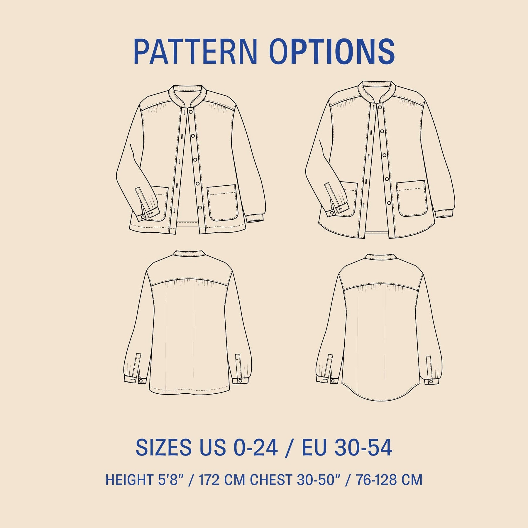 The Artist Jacket Sewing Pattern is a relaxed, functional workwear-inspired piece with dropped shoulders, a front button placket, large patch pockets, and a minimalistic banded collar. The front and back gather to the yoke, and the sleeves are cuffed. Make the Artist Jacket with a straight or curved hemline, and skip the pockets to make a shirt. The Artist's Jacket is a satisfying project that invites you to slow down and enjoy every stitch.
