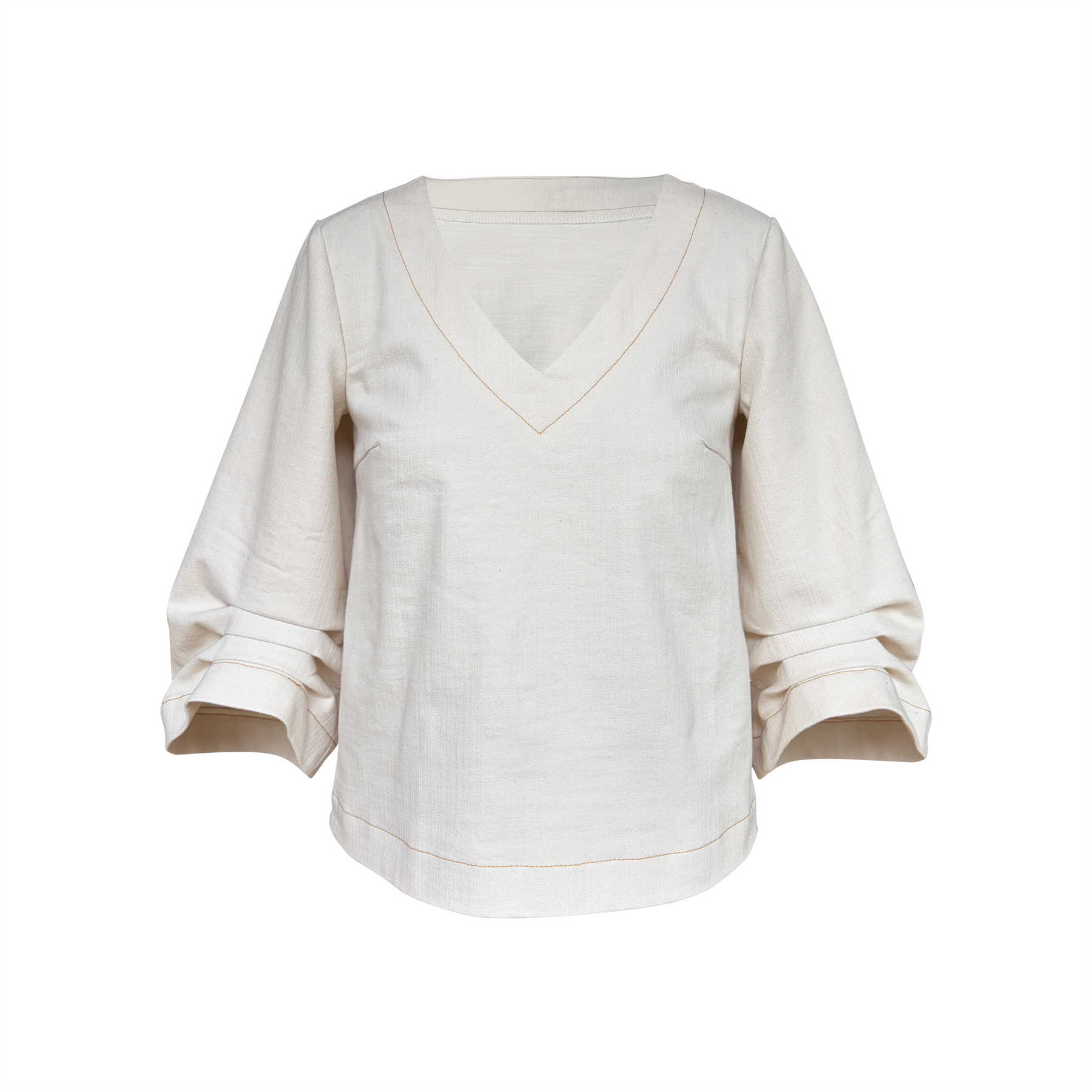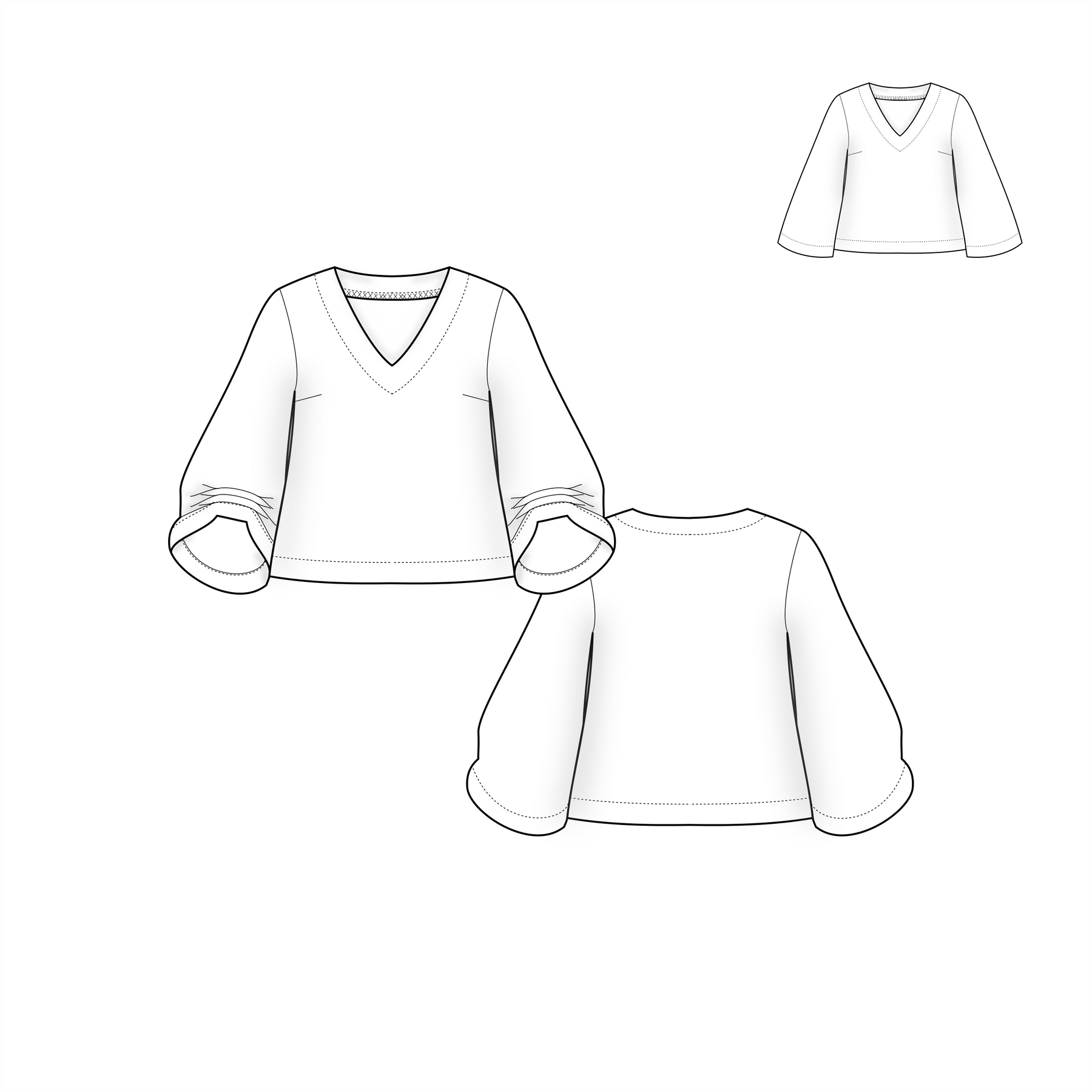 This is a top with that wow factor. It has pleated wide 3/4 length sleeves. Or unpleated sleeves if you prefer a more subdued look. It also has a somewhat short bodice with a deep V-neck. It also features a neck facing and bust darts.